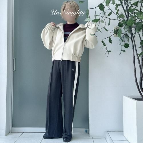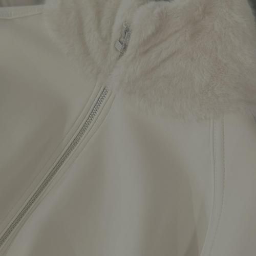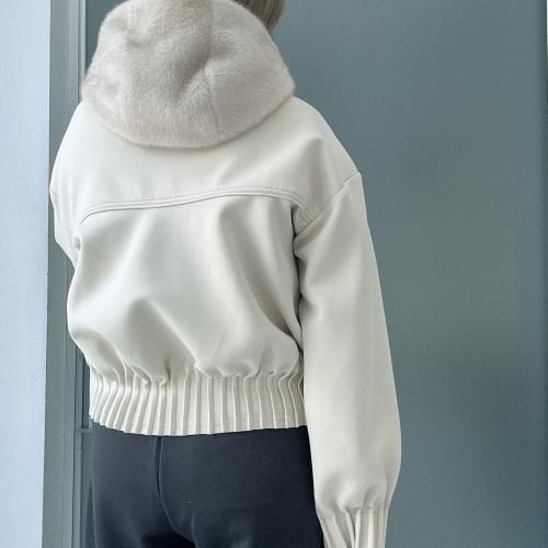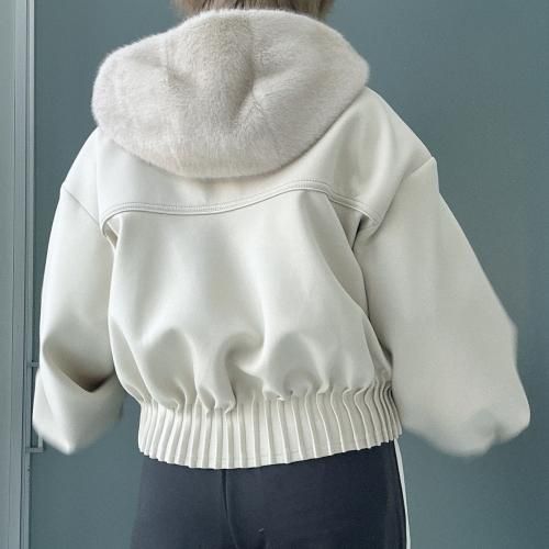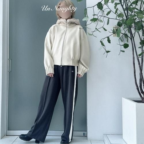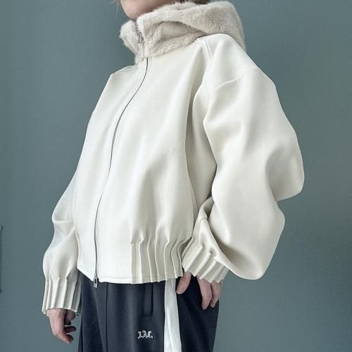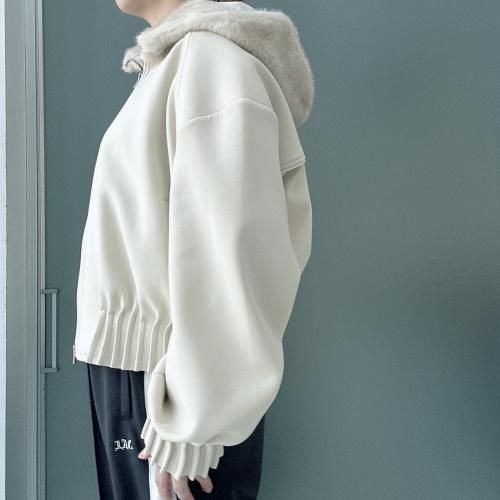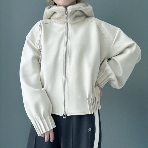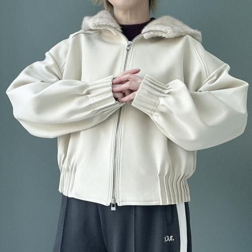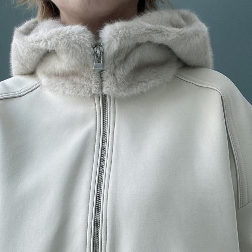 フードには上品なフェイクファーをあしらい、顔まわりにリッチなニュアンスをプラスしました。ジップアップ仕様で着脱しやすく、デイリーからお出かけまで幅広く活躍します。