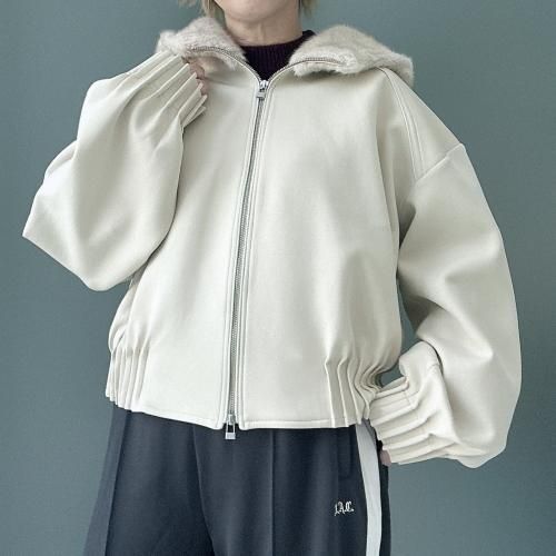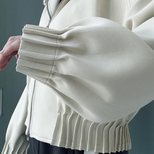 ふんわりとしたボリューム袖とギャザー入りの裾が特徴的なショート丈ジャケット。